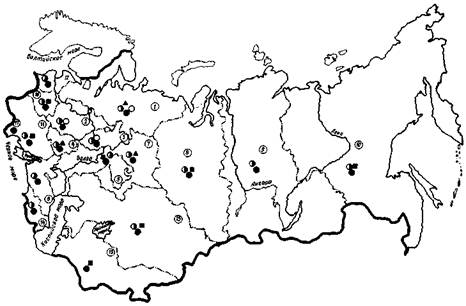 Экономические районы СССР: 1 - Северо-Западный; 2 - Центральный: 3 - Волго-Вятский; 4 - Центрально-Черноземный; 5 - Поволжье; 6 - Северо-Кавказский; 7 - Уральский; 8 - Западно-Сибирский; 9 - Восточно-Сибирский; 10 - Дальневосточный; 11 - Украинская ССР; 12 - Прибалтийский; 13 - Среднеазиатский; 14 - Закавказский; 15 - Казахстанский; 16 - Белорусский; 17 - Молдавская ССР