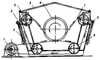 1 - электродвигатель; 2 - шкив ведущего вала; 3 - станина; 4 - верхний шкив; 5 - верхний щит; 6 - стальной цилиндр; 7 - ремни; 8 - винт регулировки положения верхнего шкива; 9 - шкив ведомого вала