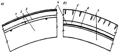 а - самонапряженная; б - железобетонная преднапряженная; 1 - резино-битумная защита с бумажным обертыванием; 2 - напрягающий бетон; 3 - арматурный каркас; 4 - стальной цилиндр; 5 - преднапряженная арматура в виде обмотки; 6 - дефекты в виде усадочных трещин и отслоений (характерно только для преднапряженной трубы); 7 - наружный и внутренний слой из мелкозернистого бетона