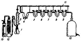 1.7. В коническую колбу вместимостью 250 мл наливают 100 мл серной кислоты. Колбу закрывают пробкой с двумя отверстиями, в которые вставлены стеклянные трубки, согнутые под прямым углом. Одна из трубок (по ходу газа) доходит до дна колбы, вторая кончается под пробкой. Длинную трубку присоединяют к аппарату Киппа с углекислым газом. Открыв кран у аппарата, пропускают ток углекислого газа через колбу в течение 3 мин. В это время отвешивают на сухом часовом стекле 1 - 1,5 г шлама. Приоткрыв пробку быстро всыпают шлам в колбу, не прекращая тока газа; взвешивают стекло и по разности определяют навеску. Содержимое колбы кипятят 30 мин, пропуская все время ток углекислого газа. Затем снимают колбу с плитки и, не прекращая тока газа, охлаждают содержимое колбы. После чего отсоединяют колбу от прибора Киппа, прибавляют 150 мл прокипяченной холодной воды и титруют 0,1 г. раствором перманганата калия до розового окрашивания, не исчезающего в течение 20 - 30 с.