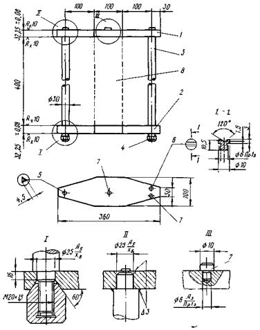 1 - пластина верхняя; 2 - пластина нижняя; 3 - тяга; 4 - гайка специальная; 5 - репер с трехгранным керном глубиной 0,75 мм; 6 - репер с продольным керном; 7 - репер с плоским окончанием; 8 - бетонный образец-призма