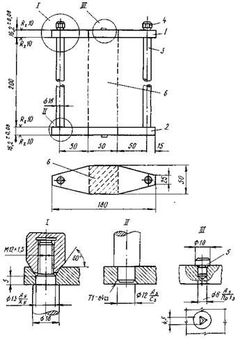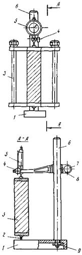 1 - пластина верхняя; 2 - пластина нижняя; 3 - тяга; 4 - гайка специальная; 5 - репер с трехгранным керном глубиной 0,75 мм; 6 - бетонный образец-призма