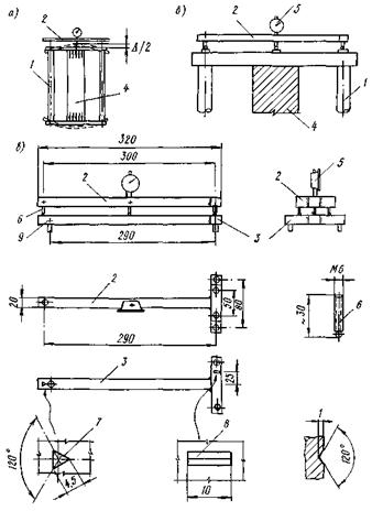 б) измерительное устройство («краб») с индикатором часового типа с ценой деления 0,01 мм для замеров выгиба пластин кондуктора или штатив с аналогичным индикатором (рис. 4, 5);