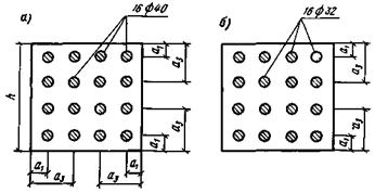 Дано. Колонна сечением 0,4´0,4 м (40´40 см), расчетная длина колонны l0 = 4,20 м (420 см), бетон класса В40 [Rbn = 29 МПа (296 кгс/см2), Rbu = 29/0,83 = 34,9 МПа (356 кгс/см2)], арматура класса А-III [Rsn = 390 МПа (4000 кгс/см2), Rscu = 390/0,9 = 433 МПа (4422 кгс/см2)] площадью сечения Аs,tot = 0,0201 м2 (201 см2) (16 стержней диаметром 40 мм); площадь одного стержня Аs1 = 12,56×10-4 м2 (12,56 см2); 12 стержней расположено по периметру колонны (из них 4 в углах) с расстоянием от боковой поверхности колонны до осей арматуры а1 = 0,05 м (5 см), 4 стержня в центральной зоне а3 = 0,15 м (15 см) (рис. 3, а). Расчетное значение центрально приложенной силы (от постоянных и длительных нагрузок) 8000 кН.