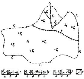 1 - 3 - граничные условия: 1 - первого рода H = H(r, t) на контурах; а - внешних линейных Г1; б - внутренних линейных (g1); в - внутренних точечных (g1); 2 - второго рода на внешних контурах Г2 линейных; а - для Q = Q(p, t); б - для Q = 0; внутренних (g2); в - линейных для Q = Q(р); г - точечных для Q = Q(p, t); 3 - третьего рода на контурах; а - внешних Г3; б - внутренних линейных g3; в - внутренних точечных g3; 4 - граница перехода трехслойной зоны D1 в однослойную D2