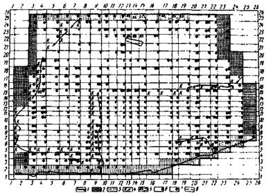В результате выполненной дискретизации составлена сеточная модель исследуемой области фильтрации (рис. 5), состоящая из 676 (26´26) блоков для одного водоносного горизонта. Из них действительных 536. К зоне D1 приурочено 506 блоков, к зоне D2 - 30. Число блоков с ГУ II рода - 318, из них: 34 моделируют внешние плановые границы в виде непроницаемого контура и 284 моделируют утечки из водонесущих коммуникаций. Число блоков с ГУ III рода - 108, из них: 48 моделируют внешние плановые границы, включая основную реку и озера; 60 моделируют внутренние водотоки в виде каналов, озер, мелких рек. Инфильтрация атмосферных осадков задавалась на территории не подверженной экранированию. К ней приурочено 202 блока. На этой же территории учитывалось испарение с уровня грунтовых вод.