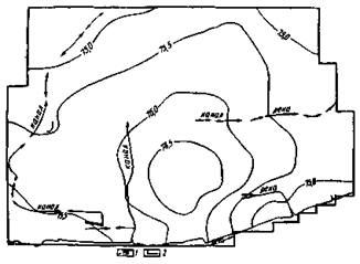 1 - изолиния максимальных прогнозных уровней грунтовых вод в абсолютных отметках, м; 2 - модельная аппроксимация внешних плановых границ области фильтрации