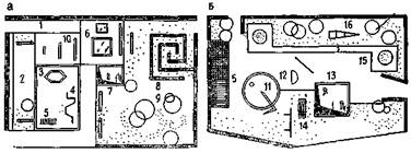а - дошкольного возраста; б - младшего школьного возраста; 1 - дорожка для катания на самокатах; 2 - лиана для лазания; 3 - песочница; 4 - качели; 5 - навес; 6 - площадка для игр; 7 - бассейн; 8 - лабиринт из стриженого кустарника; 9 - газон; 10 - стенка для рисования; 11 - песочница с горкой) 12 - карусели; 13 - бассейн; 14 - гимнастические снаряды; 15 - места для игры в мяч; 16 - ракета