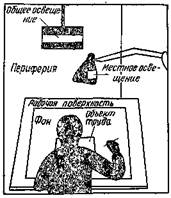 Различение объектов зрительной работы при фиксированном направлении линии зрения работающих на рабочую поверхность |