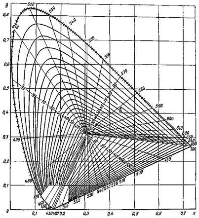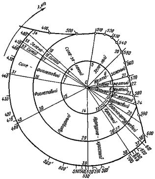 Примечание. Цветовой тон и насыщенность цвета определены по равноконтрастной диаграмме цветности (рис. 3) относительно источника С.