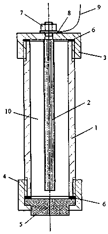 1. корпус (стакан); 2. стержень из красной меди; 3. крышка для крепления стержня; 4. крышка пробки; 5. пористая пробка; 6. уплотнительное кольцо; 7. гайка; 8. наконечник проводника; 9. проводник; 10. полость, заполняемая насыщенным раствором сульфата меди.