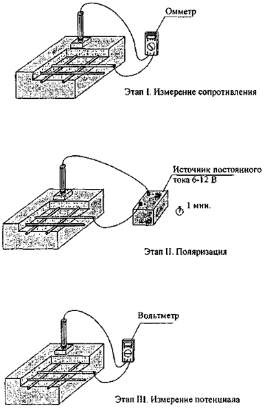 Если сопротивление не превышает 100 кОм, отключают омметр и подключают источник постоянного тока. Положительный полюс источника тока подключают к арматуре, отрицательный полюс подключают к электроду сравнения и в течение 1 мин поляризуют стальную арматуру анодным током.