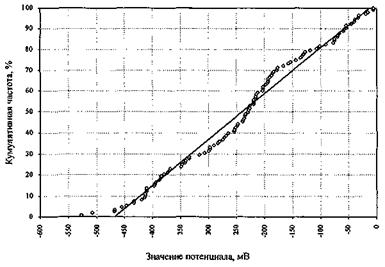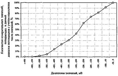 В первом случае, для построения диаграммы значения потенциалов разбивают на диапазоны с шагом 50 мВ, затем подсчитывают число отсчетов, попавших в каждый диапазон в процентном отношении к общему числу измерений. По полученным данным строят кривую распределения процентного числа измерений по диапазонам с накоплением от наименьших значений к большим значениям.