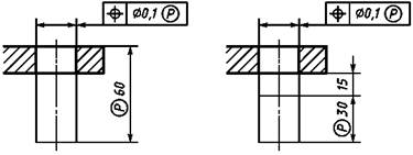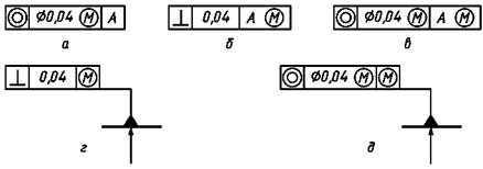 - после числового значения допуска и буквенного обозначения базы (см. рисунок 32в) или без буквенного обозначения (см. рисунок 32д), если зависимый допуск связан с действительными размерами рассматриваемого и базового элементов.