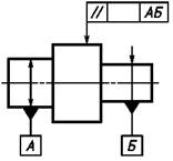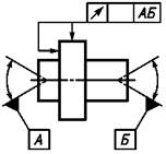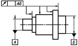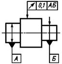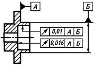 Допуск радиального биения отверстия - 0,01 мм. Первая база - поверхность А. Вторая база - ось поверхности Б. Допуск торцового биения относительно тех же баз - 0,016 мм |