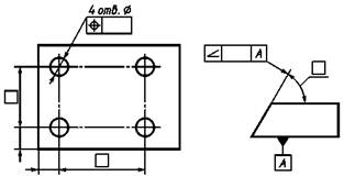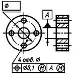 Позиционный допуск осей четырех отверстий - Æ 0,1 мм (допуск зависимый). База - ось отверстия А (допуск зависимый) |