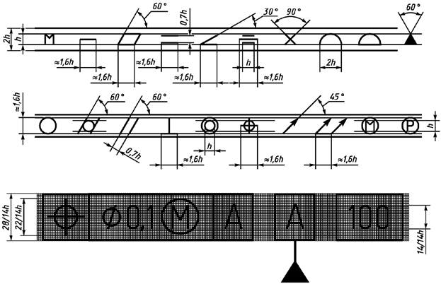 соответственно знаками 2. Указание допусков формы и расположения поверхностей в текстовых документах или в технических требованиях графического документа следует приводить по аналогии с текстом пояснений к условным обозначениям допусков формы и расположения, приведенным в настоящем приложении. При этом поверхности, к которым относятся допуски формы и расположения или которые приняты за базу, следует обозначать буквами или приводить их конструкторские наименования. Допускается