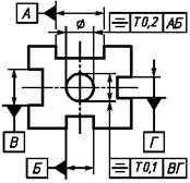 Допуск симметричности оси отверстия относительно общей плоскости симметрии пазов АБ - Т 0,2 мм и относительно общей плоскости симметрии пазов ВГ - Т 0,1 мм |