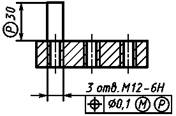 Позиционный допуск трех резьбовых отверстий - Æ 0,1 мм (допуск зависимый) на участке, расположенном вне детали и выступающем на 30 мм от поверхности |