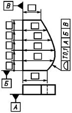 6.10. Если необходимо задать допуск расположения относительно комплекта баз, то буквенные обозначения баз указывают в самостоятельных частях (третьей и далее) рамки. В этом случае базы записывают в порядке убывания числа степеней свободы, лишаемых ими (см. рисунок 30).