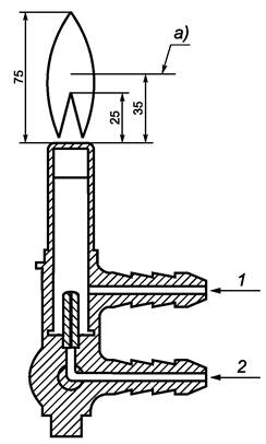 d) записывают высшую температуру пламени (с термопарой), время горения и высоту пламени. Время от момента воспламенения до момента угасания (время горения) измеряют с помощью градуированного секундомера. Высота пламени должна быть измерена от основания пламени до высшей точки;