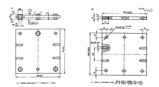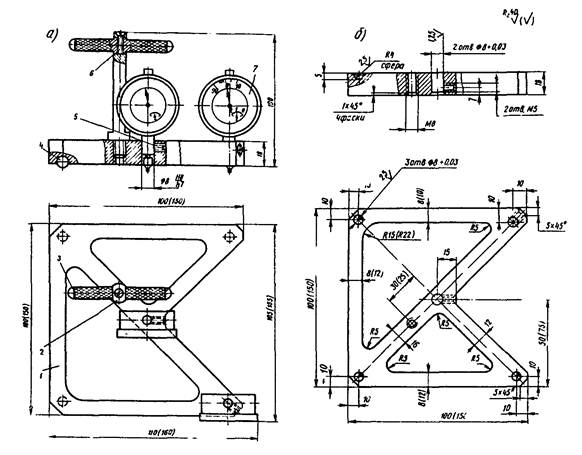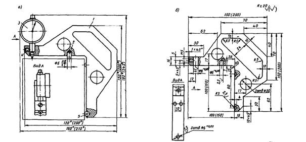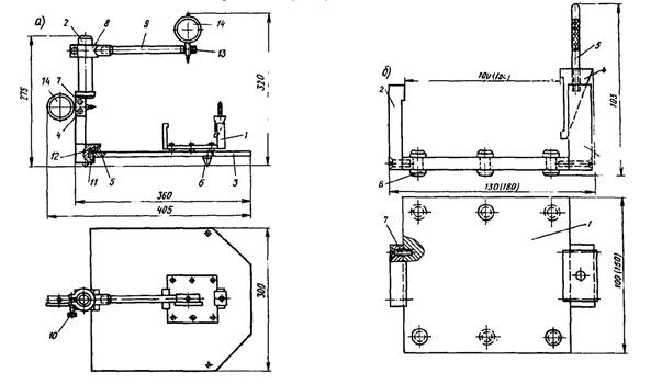 1.8. При отсутствии переносных приборов, показанных в приложениях 6 и 7, можно изготовить приборы по типу представленных в приложениях 4 и 5 «Рекомендаций по определению неплоскостности и неперпендикулярности граней контрольных образцов» (НИИЖБ, 1978)