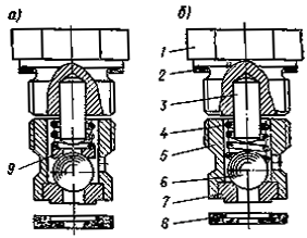 а - 2600Н; б - 7000Н; 1 - насос с гидропередачей; 2 - электродвигатель; 3 - защитно-отключающее устройство с выключателем; 4 - эксцентрик (2600Н) или диск-маховик (7000Н); 5 - поршень; 6 - маслофильтрующая пробка; 7 - пружины поршня; 8 - мембрана; 9 - всасывающий клапан; 10 - емкость с краской; 11 - всасывающий рукав с фильтром; 12 - перепускной рукав; 13 - нагнетательный клапан; 14 - перепускной клапан; 15 - рукав высокого давления; 16 - пистолет; 17 - фильтр высокого давления; 18 - регулятор давления; 19 - подшипник