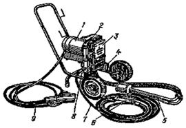 Рис. 1. Агрегат безвоздушного распыления 2600Н 1 - электродвигатель; 2 - выключатель в защитно-отключающее устройство; 3 - насос; 4 - тележка со съемной рукояткой; 5 - всасывающая система; 6 - пистолет; 7 - рукав высокого давления; 8 - фильтр высокого давления; 9 - электрокабель |