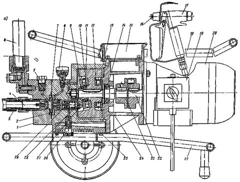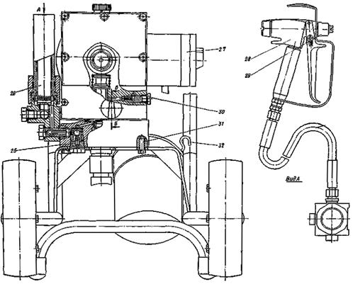 а - вид сбоку; б - вид спереди; 1 - корпус ступени краски; 2 - перепускной клапан; 3 - мембрана; 4 - вкладыш полиамидный; 5 - поршень; 6 - корпус масляной ступени; 7 - роликоподшипник с ограничительным кольцом; 8 - роликоподшипник; 9 - маслозаливочная пробка; 10 - крыльчатка; 11 - электродвигатель; 12 - съемная рукоятка; 13 - конденсатор; 14 - резервуар для фильтра; 15 - болт с внутренним шестигранником; 16 - патрубок; 17 - перепускной рукав; 18 - всасывающий рукав; 19 - регулятор давления; 20 - штепсельный разъем; 21 - тележка; 22 - фильтр; 23 - наконечник всасывающего рукава; 24 - наконечник перепускного рукава; 25 - нагнетательный клапан; 26 - фильтр высокого давления; 27 - защитно-отключающее устройство с выключателем; 28 - пистолет; 29 - сопло; 30 - маслофильтрующая пробка; 31 - болт с внутренним шестигранником; 32 - крюк