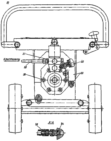 а - вид сбоку; б - вид спереди; 1 - корпус ступени краски; 2 - вставка полиамидная; 3 - рукав высокого давления; 4 - клапан всасывающий; 5 - нагнетательный клапан; 6 - фильтр высокого давления; 7 - мембрана; 8 - регулятор давления; 9 - роликовый упорный подшипник; 10 - маховик; 11 - подшипник игольчатый; 12 - роликовый упорный подшипник; 13 - корпус масляной ступени; 14 - шарикоподшипник; 15 - ящик для инструмента; 16 - сопло; 17 - пистолет; 18 - съемная рукоятка; 19 - защитно-отключающее устройство с выключателем; 20 - электродвигатель; 21 - тележка; 22 - вал электродвигателя; 23 - муфта; 24 - корпус; 25 - болт; 26 - пробка маслофильтрующая; 27 - поршень; 28 - вставка; 29 - подшипник игольчатый; 30 - рукав высокого давления; 31 - соединитель резьбовой для рукава высокого давления; 32 - перепускной клапан; 33 - маслозаливочная пробка; 34 - соединитель резьбовой для перепускного рукава; 35 - перепускной рукав; 36 - болты крепления