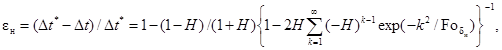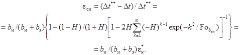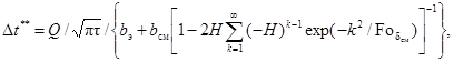 3.6. Влияние толщины и теплофизических характеристик плоского нагревателя на значение избыточной температуры в его центре можно оценить, пользуясь известным решением симметричной относительно плоскости расположения источника тепла задачи о распространении мгновенного теплового импульса в системе, состоящей из двух полубесконечных тел и бесконечной пластины нагревателя толщиной 2dн, размещенной между ними.