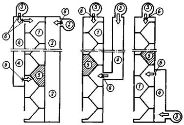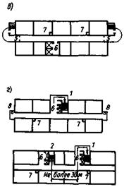1 - лестничная клетка; 2 - шахта лифтов; 3 - вентилятор подачи воздуха; 4 - канал для подачи воздуха; 5 - рассечка; 6 - клапан для подачи воздуха