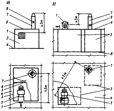 Рис. 2. Схема взаимного расположения воздухозаборного и выбросного отверстий вентиляционных систем противодымной защиты с вентиляторами, установленными на покрытии здания в вентиляционной камере, разделенной несгораемой перегородкой (а) и в обособленных вентиляционных камерах на техническом этаже (чердаке) здания (б)