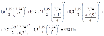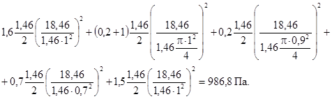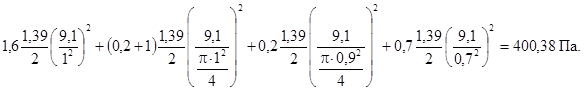 Вычислим требуемое давление вентилятора подачи воздуха в верхнюю зону лестничной клетки (см. рис. 15). Величины местных сопротивлений для этой схемы определены в примере 2. Скорость воздуха на участках воздуховодов вычислим с учетом конкретной величины подачи воздуха в зону - 9,1 м3 · с-1. Потери давления в сети вентилятора верхней зоны лестничной клетки составляют: