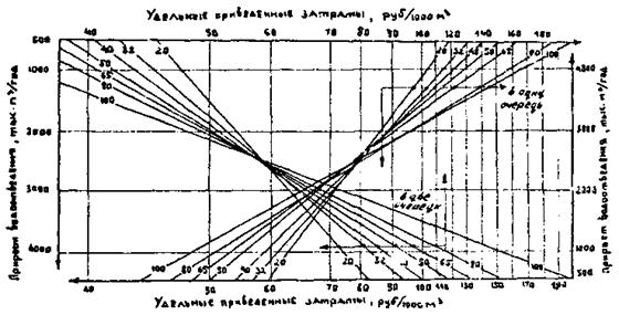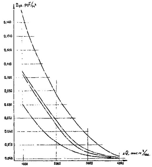7.5. Графическая зависимость удельных приведенных затрат на строительство и эксплуатацию канализационных очистных сооружений производительностью 64 тыс. м3/сутки от темпов прироста водоотведения и очередности строительства (рис. 5) позволяет сделать следующий вывод: при низких темпах жилищного строительства (50 - 200 тыс. м2 жилой площади в год) экономически целесообразно строительство в четыре очереди; при высоких темпах роста (250 - 500 тыс. м2/год) - одну, две очереди (варианты равноэкономичны).