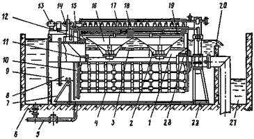 Полупромышленный микрофильтр представляет собой сетчатый цилиндрический барабан диаметром 300, длиной 200 мм. Барабан размещается в металлическом резервуаре и на 3/5 диаметра заполняется водой. Сточная вода на микрофильтр поступает самотеком. Барабан микрофильтра приводится во вращение электродвигателем с редуктором. Причем число оборотов барабана изменяется ступенчато в пределах от 5 до 20 об/мин. Для экипировки барабана применяются сетки из нержавеющей стали (две из них поддерживающие), между ними располагается рабочая сетка. Размер ячеек рабочей сетки составляет 40 - 90 микрон. Поддерживающие сетки, воспринимающие нагрузки от перепада давления при фильтровании и промывке, имеют размер ячеек 1,25 мм. Промывка барабана осуществляется непрерывно водопроводной или очищенной на микрофильтре водой.