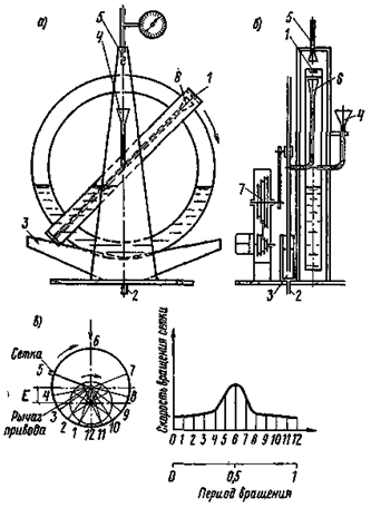Лабораторная модель микрофильтра может быть изготовлена в виде вращающейся колонки прямоугольной формы сечением 30´40 мм и высотой 500 мм. На одном из концов колонки закрепляется сетка, через которую фильтруется сточная вода. Фильтрующая площадь микросетки составляет 1 см2. Колонка с микросеткой приводится во вращение электродвигателем с редуктором. Число оборотов колонки изменяется ступенчато в пределах от 5 до 20 об/мин. Редуктор и специальный механизм (см. рис. 3) обеспечивают неравномерное вращение сетки в пределах одного оборота. При движении сетки под промывным устройством скорость увеличивается до значений, близких к натурным. Далее движение сетки замедляется настолько, что длительность фильтрования приближается к натурной.
