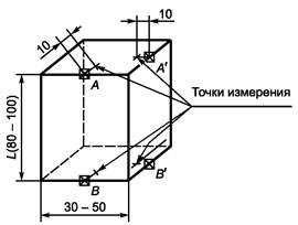 Выполняют два измерения расстояния L (рисунок 1) штангенциркулем с погрешностью до 0,1 мм параллельно средним линиям (АВ и А'В') двух взаимно перпендикулярных граней. Измерения выполняют ориентировочно на расстоянии 10 мм от ребра соответствующей грани. Места для измерения помечают огнеупорной краской.