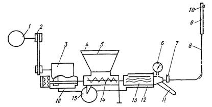 Примечание. Прекращение работы пневмонасоса и включение его в работу с помощью воздушного крана управления подачей материала обусловлено тем, что при открытом кране воздух от компрессора, минуя пневмоцилиндры, устремляется по линии наименьшего сопротивления через кран в атмосферу, а при закрытом кране управления подачей материала воздух идет через золотниковый механизм в пневмоцилиндры, приводя насос в действие.