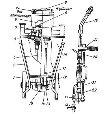 4.5. Для пуска агрегата в работу необходимо загрузить бункер шпатлевочным составом, включить компрессор, открыть кран подачи состава на удочке, направив ее форсункой в бункер, затем открыв кран золотникового механизма, отрегулировать расход шпатлевочного состава; после этого следует произвести регулировку факела, для чего нужно открыть кран подачи воздуха и установить необходимое давление на компрессоре (после регулировки кран подачи воздуха следует закрыть); открыв воздушный кран управления подачей состава, остановить работу пневмонасоса (при открытом кране прекращается подача шпатлевочного состава), направить удочку в сторону обрабатываемой поверхности, открыть кран подачи воздуха и, закрыв поворотом рукоятки кран управления подачей материала, нанести шпатлевочный состав на обрабатываемую поверхность.