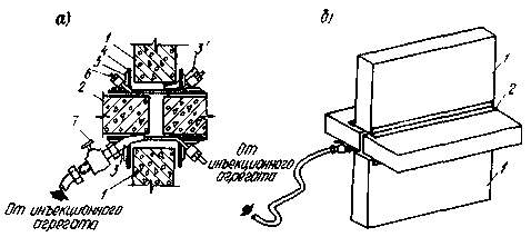 В последнее время метод инъекции начали применять при замоноличивании узлов сборных элементов современных многоэтажных зданий. В частности, при внедрении новой технологии монтажа крупнопанельных зданий без раствора насухо на упругих прокладках с последующим инъецированием полостей стыка раствором.