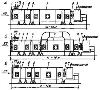 а - традиционная схема; б - схема кондиционера, регулируемого по методу «оптимальных режимов»; в - схема с управляемыми процессами обработки воздуха; 1, 3 - клапан воздушный; 2 - камера воздушная; 4 - фильтр; 5 - камера обслуживания; 6 - воздухонагреватель; 7 - камера орошения; 8 - блок присоединительный; 9 - вентиляторный агрегат