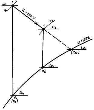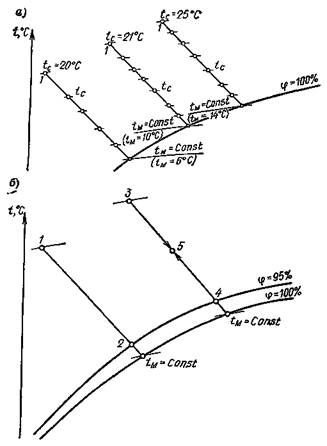 2.1. Управляемыми процессами адиабатного охлаждения и увлажнения воздуха названы процессы тепло- и влагообмена, в результате которых непосредственно после смесительных контактных аппаратов получают воздух с переменной температурой по сухому термометру при постоянной, фиксированной температуре по мокрому термометру (рис. 2, а).