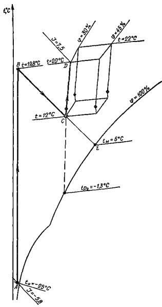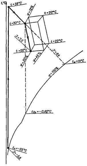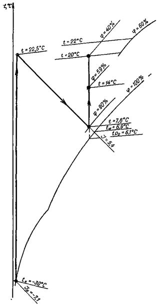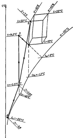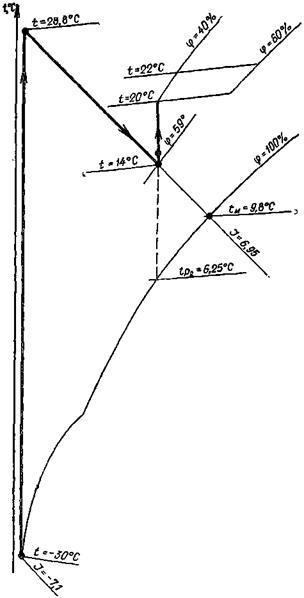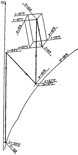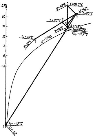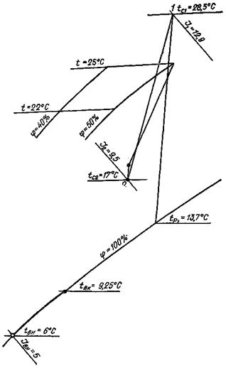 Для получения этих параметров температура точки росы воздуха после оросительной камеры должна быть около 0 °С или ниже, что при адиабатном режиме работы смесительного контактного аппарата приведет к замерзанию циркуляционной воды. Поэтому энтальпия и относительная влажность воздуха в обслуживаемом помещении всегда будут больше минимально допустимых значений (рис. 3).