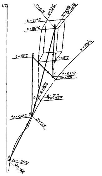 Разность энтальпий в точках а (минимальное значение) и l обусловливает перерасход тепла на 1 кг обрабатываемого воздуха. Как показывают расчеты в зависимости от процесса в помещении эта разность колеблется в среднем от 3,35 до 5,4 кДж/кг (0,8 до 1,3 ккал/кг). Средняя продолжительность стояния наружных температур воздуха до +5 °С (когда требуется увлажнение воздуха) составляет, как правило, не менее 3200 ч.