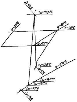 Поддержание этих параметров обеспечивают управляемые процессы, позволяющие получить непосредственно после смесительных контактных аппаратов воздух с параметрами притока при различных значениях углового коэффициента е луча процесса в помещении.