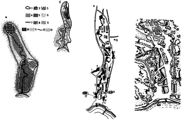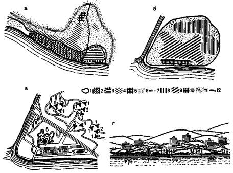 а - схема зонирования территории курорта Джанхот на 3,5 тыс. мест; зоны: 1 - курортная; 2 - комплекса санаторных учреждений; 3 - комплекса учреждений туризма; 4 - селитебная; 5 - коммунально-хозяйственная; 6 - лесопарковых насаждений и природного ландшафта; 7 - граница курорта; б - схема зонирования территории комплекса санаторных учреждений на 2500 мест; зоны: 8 - проживания лечащихся; 9 - централизованного общекомплексного обслуживания; 10 - физкультурно-спортивных сооружений; 11 - зеленых насаждений общего пользования; 12 - граница территории комплекса; 13 - реликтовый лес; в - вариант планировки комплекса санаторных учреждений на 2,5 тыс. мест: 1 - спальный корпус санатория; 2 - столовая санатория; 3 - санаторный пансионат; 4 - столовая санаторного пансионата; 5 - общекомплексный административно-приемный корпус; 6 - поликлиника; 7 - бассейн; 8 - курзал; 9 - летний кинотеатр; 10 - танцплощадка; 11 - кафе; 12 - ресторан; 13 - павильон курортного сервиса; 14 - физкультурно-спортивные площадки; 15 - музей Короленко; г - макет комплекса санаторных учреждений