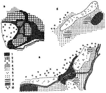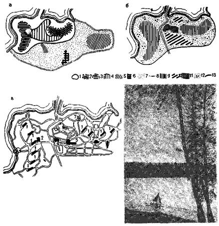 а - схема зонирования территории курорта Тишково на 3,5 тыс. мест; зоны: 1 - курортная; 2 - санаториев; 3 - пансионатов; 4 - общекурортного обслуживания; 5 - селитебная; 6 - коммунально-хозяйственная; 7 - лесопарковых насаждений и природного ландшафта; 8 - граница курорта; б - схема зонирования территории комплекса санаторных учреждений на 3,5 тыс. мест; зоны: 9 - проживания лечащихся; 10 - централизованного общекомплексного обслуживания; 11 - физкультурно-спортивных сооружений; 12 - зеленых насаждений общего пользования; 13 - граница территории комплекса; в - схема планировки комплекса санаторных учреждений: 1 - спальный корпус; 2 - столовая; 3 - административно-приемный корпус; 4 - лечебный корпус; 5 - курзал; 6 - физкультурно-спортивные площадки; 7 - летний кинотеатр; г - окрестности курорта Тишково