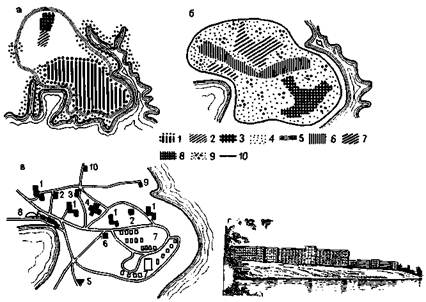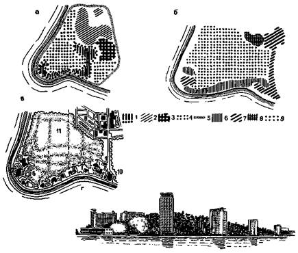 а - схема зонирования территории курорта Тамиск на 5 тыс. мест; зоны: 1 - курортная; 2 - комплекса санаториев и санаторных пансионатов; 3 - комплекса учреждений отдыха перспективного освоения; 4 - детского санатория; 5 - селитебная; 6 - коммунально-хозяйственная; 7 - лесопарковых насаждений и природного ландшафта; 8 - граница курорта; б - схема зонирования территории комплекса санаторных учреждений на 3 тыс. мест; зоны: 9 - проживания лечащихся; 10 - централизованного общекомплексного обслуживания; 11 - физкультурно-спортивных сооружений; 12 - зеленых насаждений общего пользования; 13 - граница территории комплекса; в - вариант планировки комплекса санаторных учреждений на 3 тыс. мест: 1 - спальный корпус; 2 - столовая; 3 - столовая с клубными помещениями; 4 - курортная гостиница; 5 - административно-приемный корпус; 6 - лечебный корпус; 7 - водолечебница; 8 - курзал; 9 - летний кинотеатр; 10 - танцплощадка; 11 - физкультурно-спортивные площадки; 12 - питьевая галерея; 13 - кафе; г - общий вид курорта Тамиск