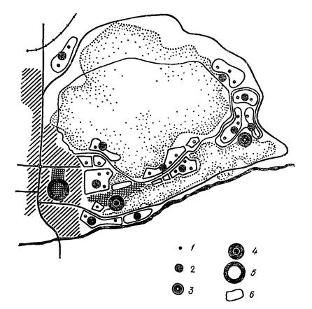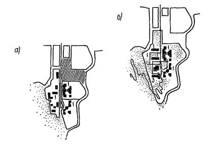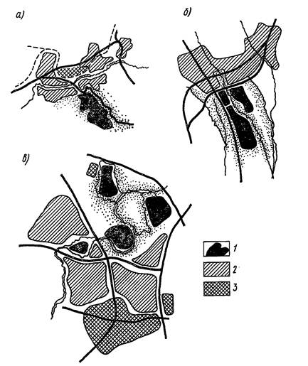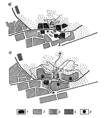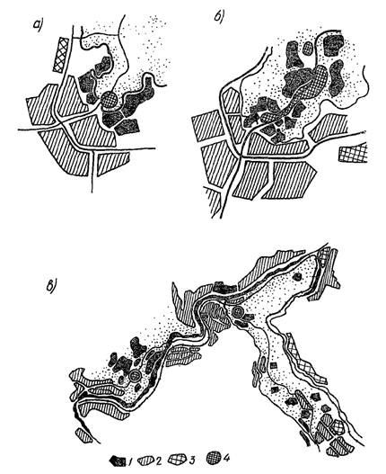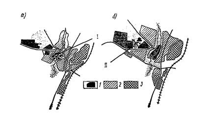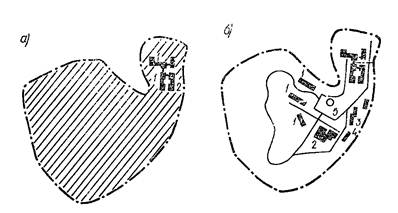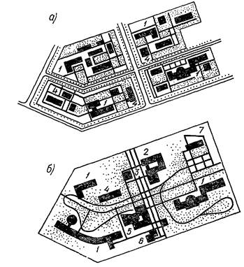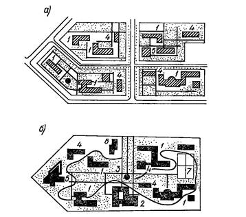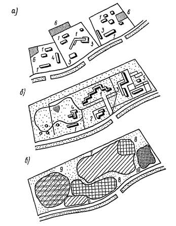3.9. Осуществление принципа четкого функционального зонирования территории бальнеологического комплекса осложняется при создании комплексов приемом централизованной застройки и при формировании комплексов путем частичной реконструкции существующих санаториев, включенных в его состав, когда сохраняется значительная часть существующих зданий (рис. 26). Однако во всех случаях необходимо стремиться с помощью композиционного приема или системы зеленых насаждений к максимальной изоляции спальных помещений от зон и учреждений массового посещения.